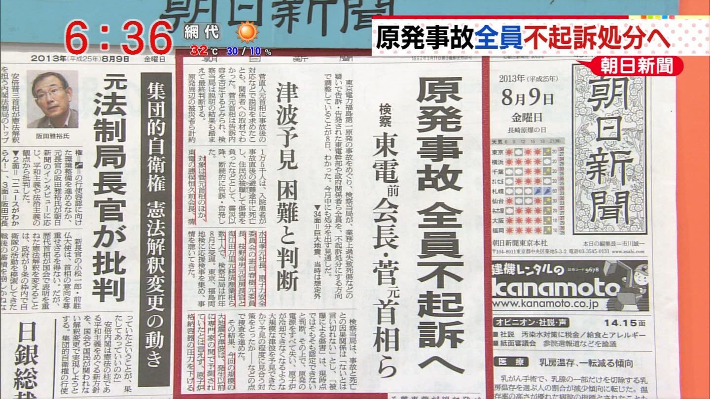 【速報】原発事故、全員不起訴へ 東電前会長や菅元首相ら