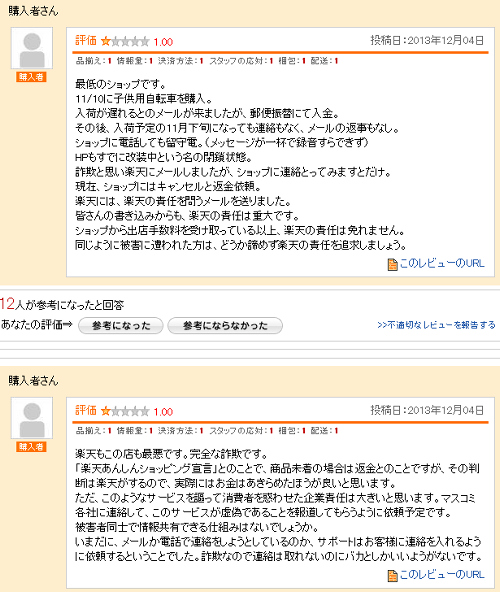 半年前からトラブルがあり、楽天にも苦情が寄せられていたこの店舗。放置した楽天側にも責任があるのではないだろうか。