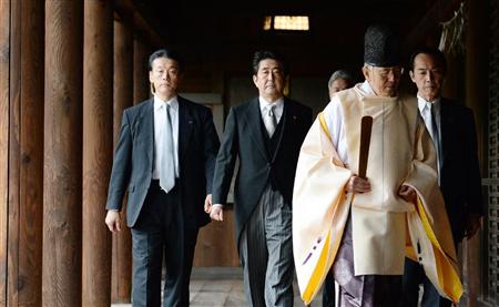 写真=靖国神社を参拝した安倍晋三首相(中央)