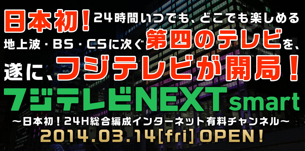 フジテレビジョンは2014年2月17日、24時間総合編成のインターネット有料チャンネル「フジテレビNEXTsmart」のサービスを3月14日に開始すると発表した。