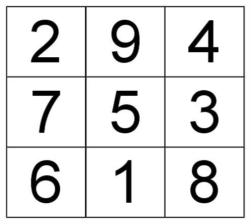 マス目の数が3×3のとき、縦・横・斜めの和はすべて15になっており、