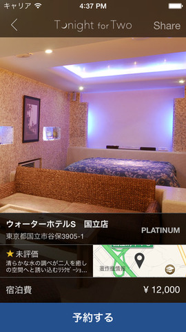 Tonight for Twoは、GPSと連動し、現在地周辺で当日夜に予約できるラブホテルを探して予約できるサービス。関東地方1都6県の約30のラブホテルと契約していた。
