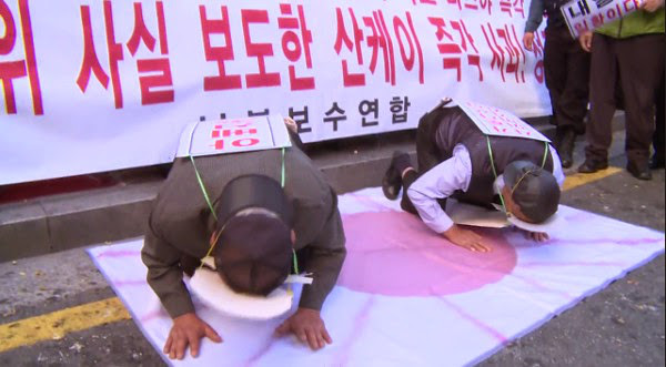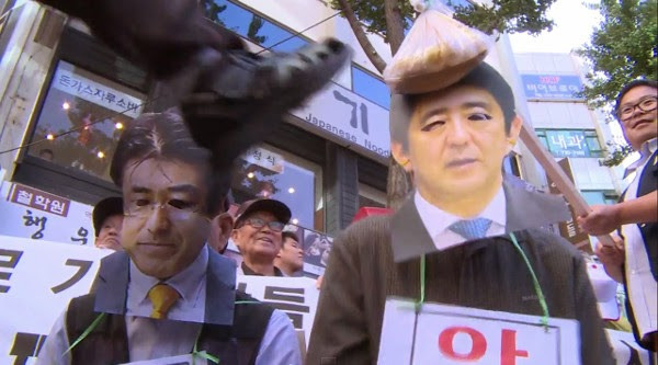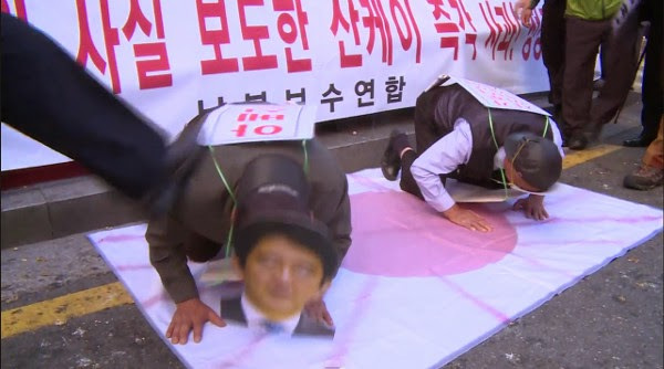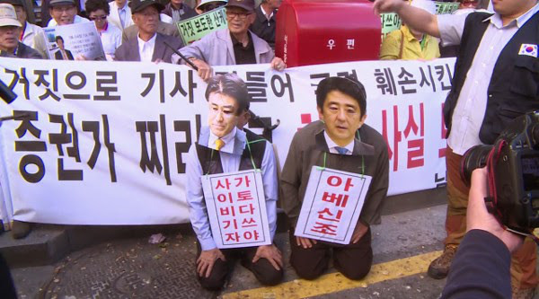 これは安倍首相と産経新聞の支局長のお面をつけた人物に土下座させ足蹴にするという衝撃的なシーンで、動画がネットにアップされ日本で拡散しています。行ったのは韓国の保守系団体など100人だったということです。