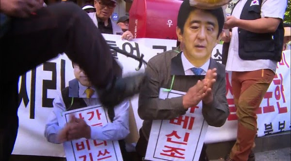 韓国の反日動画にネット民激しい怒り 安倍首相と産経支局長のお面をつけた人物に土下座させ足蹴にする