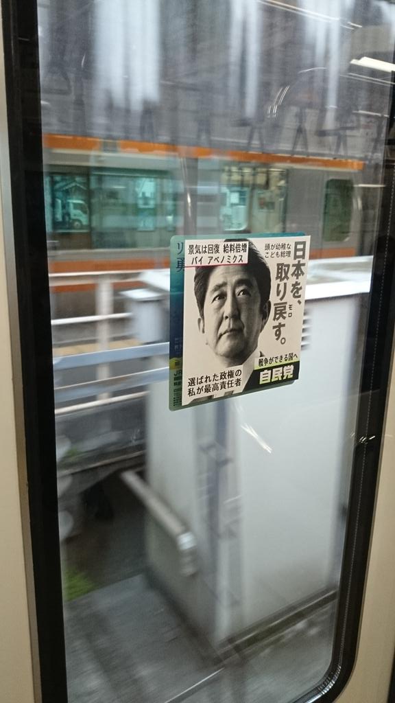 【画像】左翼、「(安倍は)頭が幼稚なこども総理」シールを山手線ドア広告に勝手に上から貼り付ける