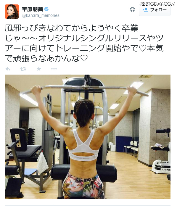 風邪をひいていたという華原だが、ようやく治ったことを報告。シングルのリリースやツアーが控えているとあって、「トレーニング開始やで」と肉体を鍛錬。トレーニングジムで広背筋を鍛えるラットマシンを使って筋トレする写真を公開し、「本気で頑張らなあかんな」と意気込みをつづった。