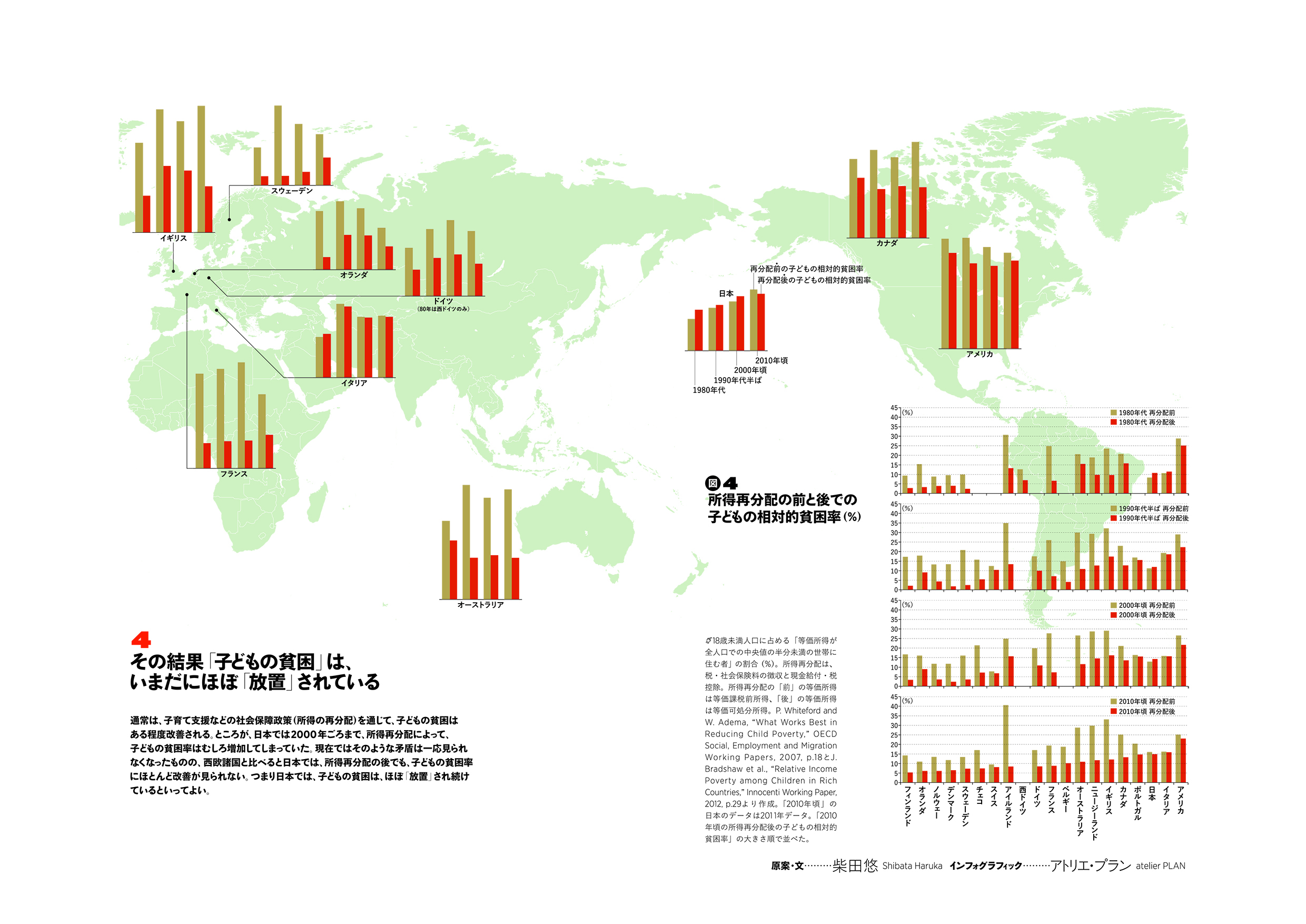 通常は、子育て支援などの社会保障政策(所得の再分配)を通じて、子どもの貧困はある程度改善される。ところが、日本では2000年ごろまで、所得再分配によって、子どもの貧困率はむしろ増加してしまっていた。現在ではそのような矛盾は一応見られなくなったものの、西欧諸国と比べると日本では、所得再分配の後でも、子どもの貧困率にほとんど改善が見られない。つまり日本では、子どもの貧困は、ほぼ「放置」され続けているといってよい。