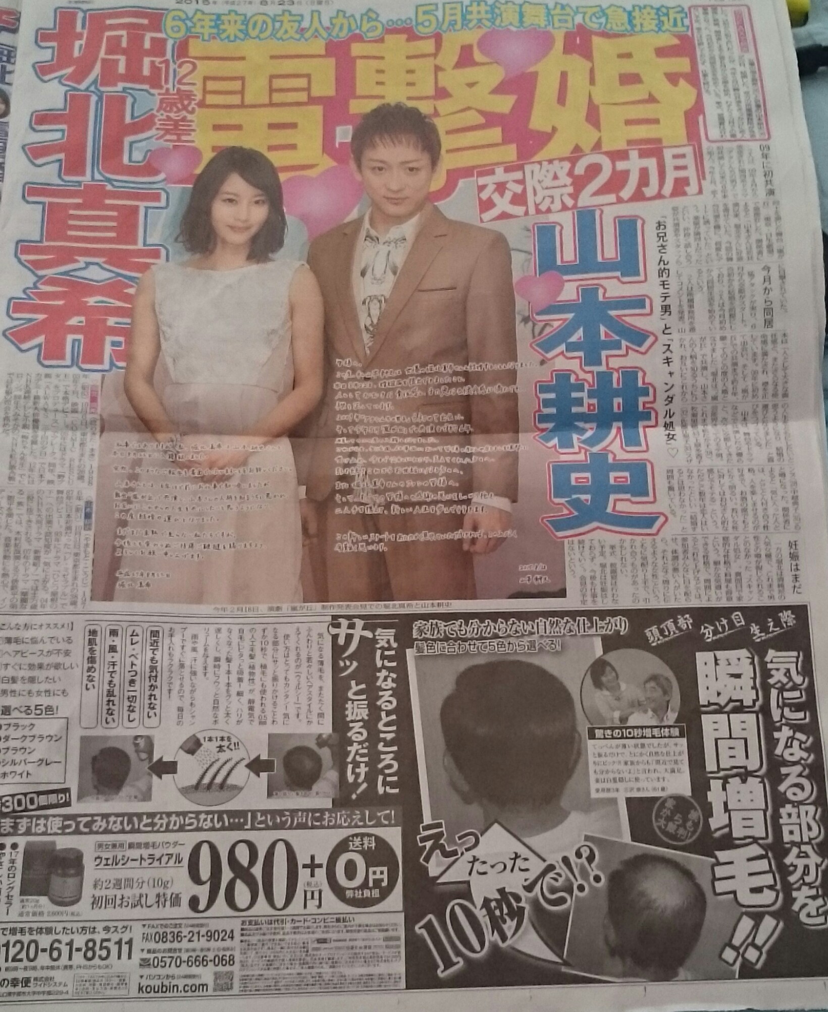 女優の堀北真希(26)と俳優の山本耕史(38)が22日に結婚したことが、双方の所属事務所から発表された。堀北は結婚発表後、有料会員向けの公式ブログでも結婚を報告した。ファンに向けて「結婚願望というものはあまりなかったのですが、彼と接するうちに自然と“結婚”ということが浮かび、そうすることで幸せになれると確信しました」と心境を告白。
