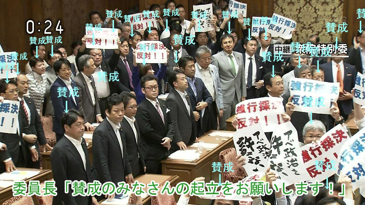 素直に座っていたら負けたとしても貴重な反対の数が稼げるのに全員立っているから全会一致w
