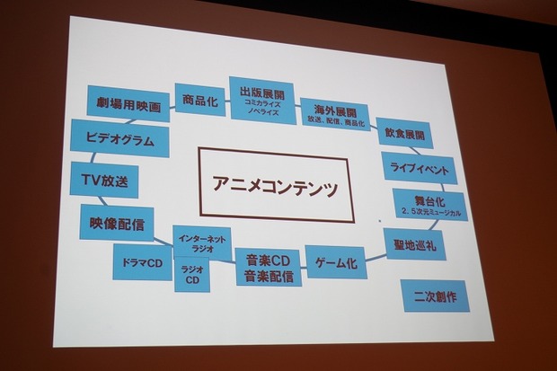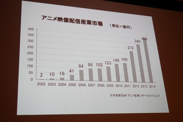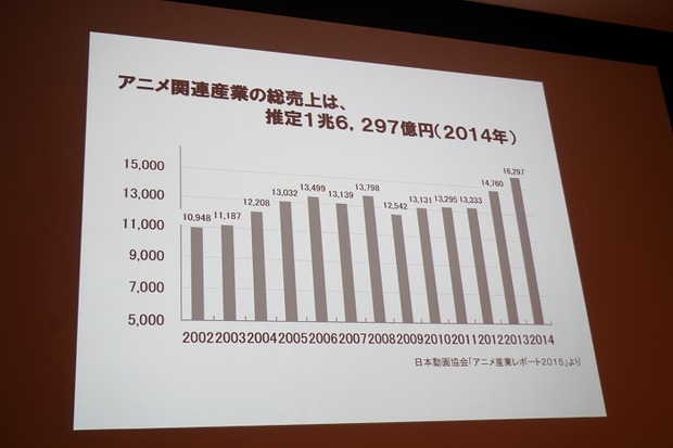 一般社団法人日本動画協会の「アニメ産業レポート2015」によると、日本のアニメ業界市場は制作会社の総売上が推定1,847億円(2014年)となる。「大きな数字に見えて、それほど大きな数字ではない」と語る亀山氏は、周辺ビジネスも含めたアニメ関連産業の総売上が推定1兆6,297億円(2014年)あることを続けた。