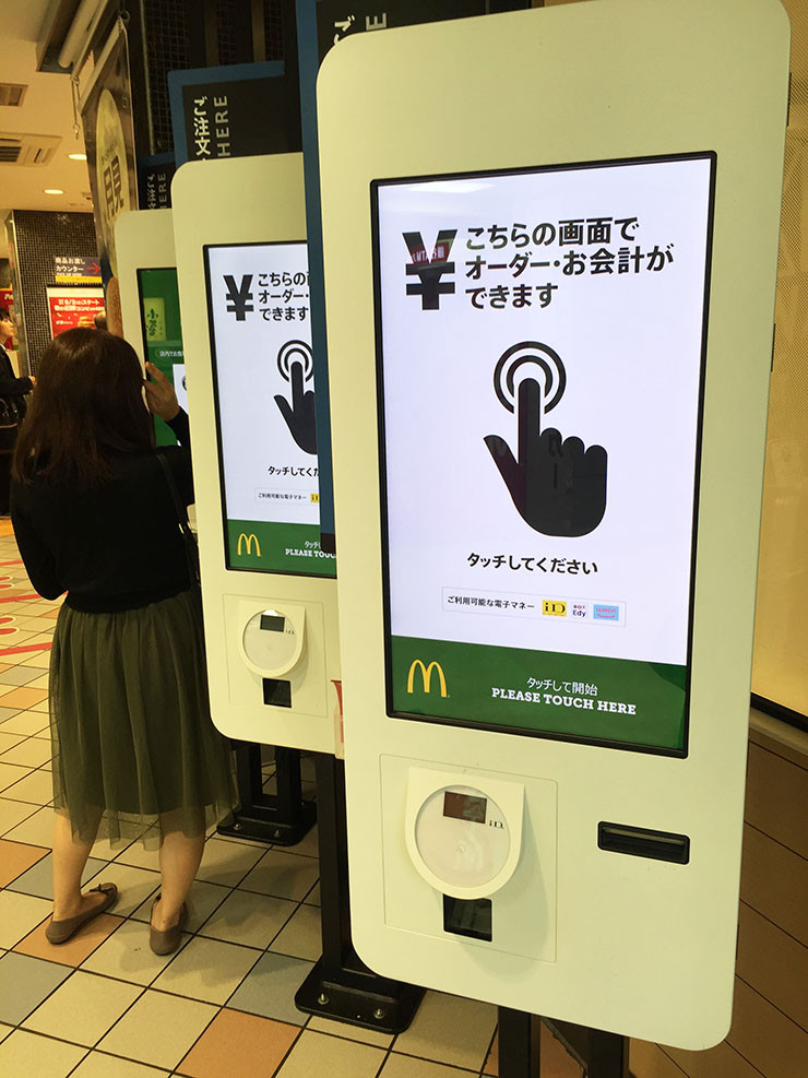 北米やヨーロッパの店舗で導入して好評を得ている、マクドナルドの無人オーダー機。客はタッチパネル式のモニターでハンバーガーやサイドメニューなどを選び、支払いはクレジットカード。料理の受取だけスタッフからしてもらうという販売方法だ。
