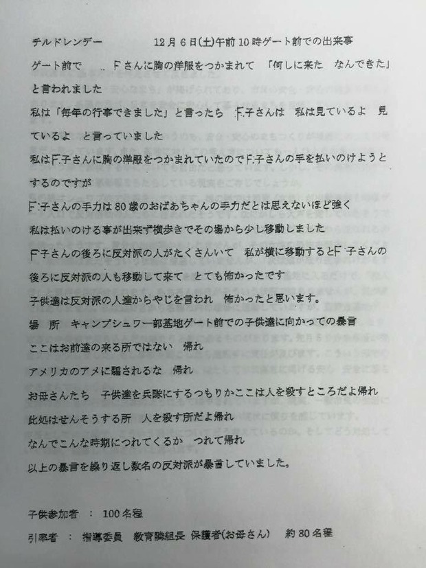 サヨクに苦しめられてる辺野古住民の陳述書が酷い 子連れの母親が暴行され子供に罵声浴びせられた等