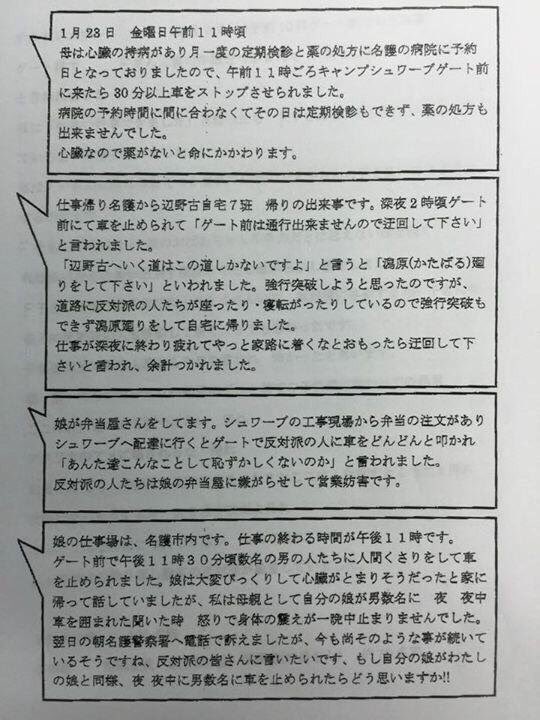 転載元スレッド:http://hayabusa3.2ch.sc/test/read.cgi/news/1476077404/サヨクに苦しめられてる辺野古住民の陳述書が酷い 子連れの母親が暴行され子供に罵声浴びせられた等