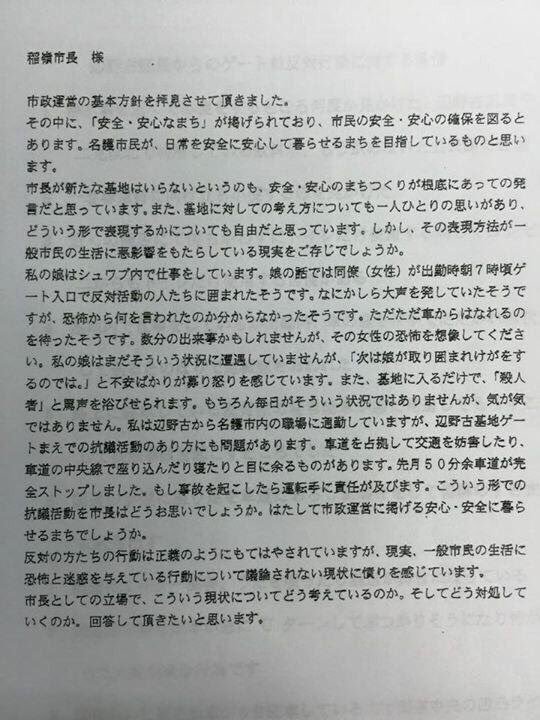 辺野古区民の陳情書。 加工されてFさんとなってるけど、原文は島袋文子。