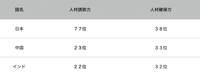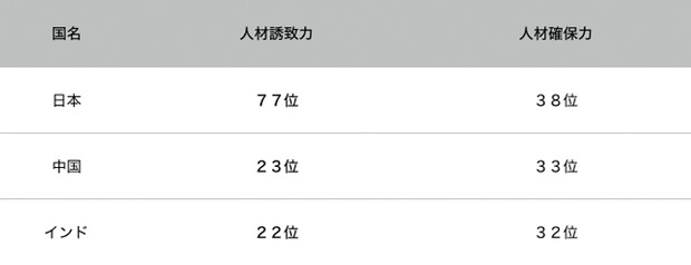 これは、世界経済フォーラム(WEF)が発表した2016〜17年版の国際競争力ランキングで示された重要な結果の一つだ。優秀な人材を誘致する力の項目で、中国は22位、インドは23位と日本の77位を大きく上回った。さらに、そうした人材を確保する力でも、日本への評価は両国に遅れを取っている。