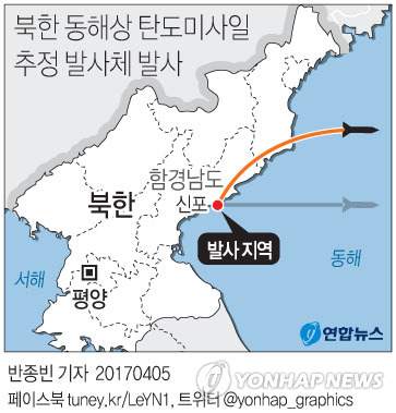 北朝鮮の北東部・咸鏡南道のシンポから飛翔体が発射された