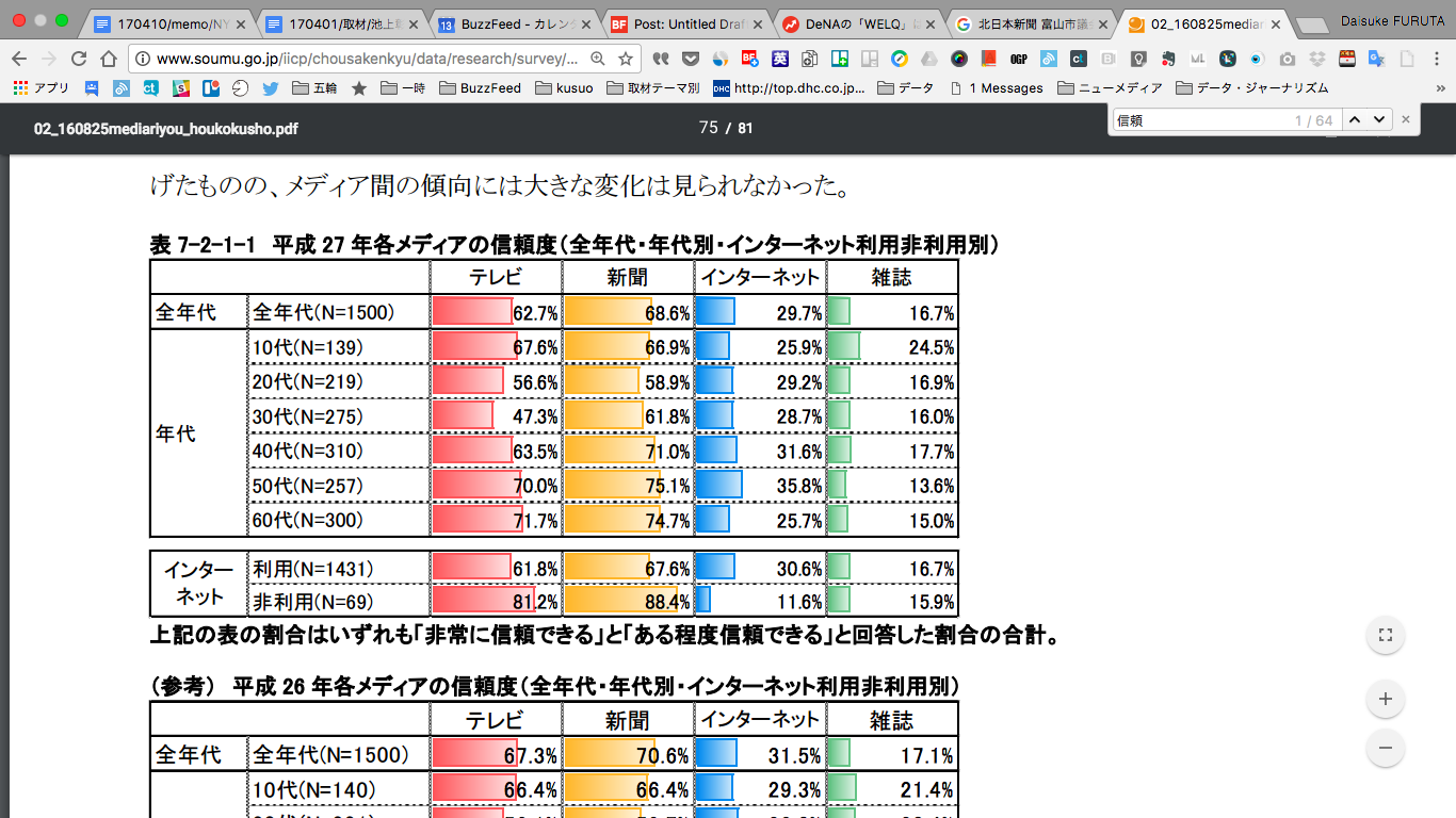 また、総務省の「平成27年 情報通信メディアの利用時間と情報行動に関する調査」によると、全体ではテレビ62.7%、新聞68.6%と高い信頼度を保っているが、若い世代ほどその数字は下がり、テレビは30代で47.3%、新聞は20代で58.9%となる。