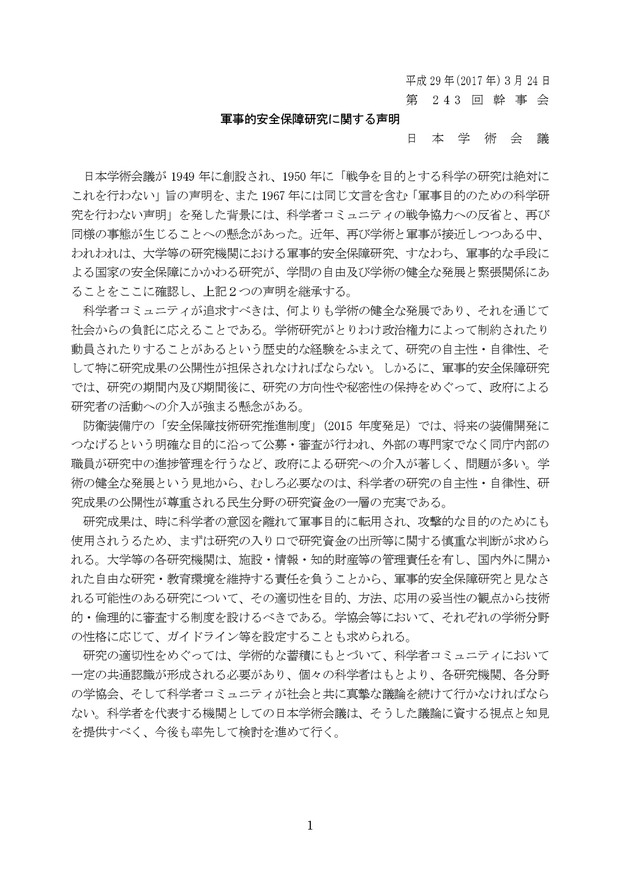 日本学術会議は14日、東京都内で総会を開き、科学者は軍事的な研究を行わないとする声明を決定したと報告した。防衛省が創設した研究助成制度も批判する内容で、技術的な優位性を確保することで有利な戦略バランスを構築する同省の取り組みを阻害する恐れがある。出席した研究者からは、自衛隊の合憲性やミサイル防衛を否定するかのような発言も飛び出した。
