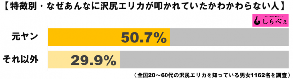 また、属性別では元ヤンの人の半数が「わからない」と回答。ヤンキーは不器用な人が多く、トゲトゲしているせいで誤解されやすい印象があるが、そんな彼らだからこそ沢尻の気持ちがわかる部分があったのだろうか。