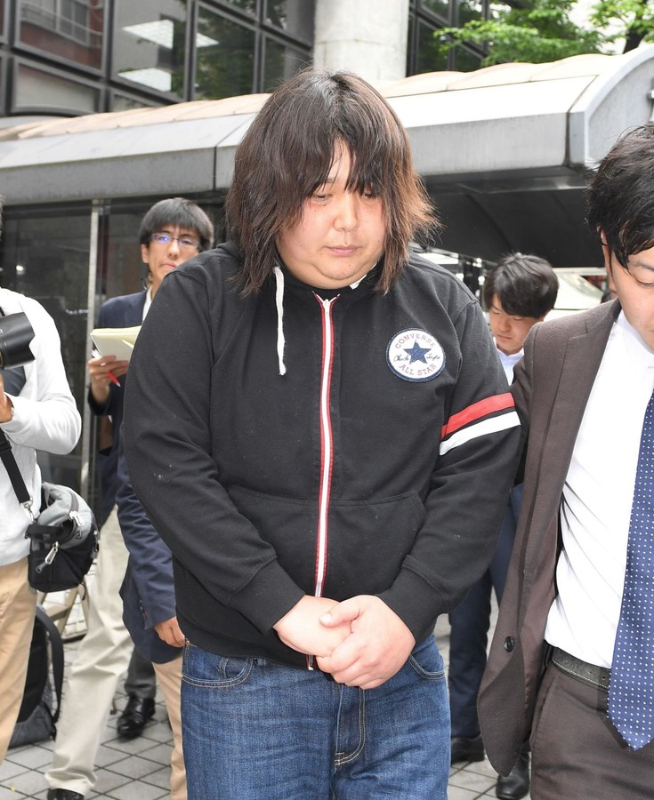 関係者に連れられ警察署を後にするガリガリガリクソン=大阪府警南署