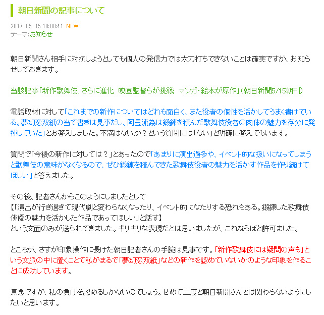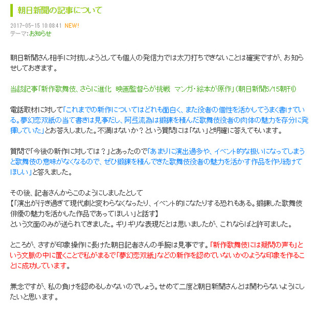 朝日新聞から取材を受けた書籍『歌舞伎四〇〇年の言葉 学ぶ・演じる・育てる』の著者が自信のブログにて取材内容について苦言を投じている。