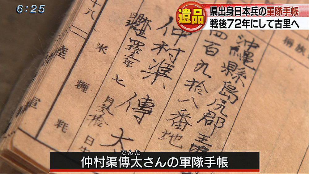 見つかったのは、玉城村出身で沖縄戦で死亡した仲村渠傳太さんの軍隊手帳です。