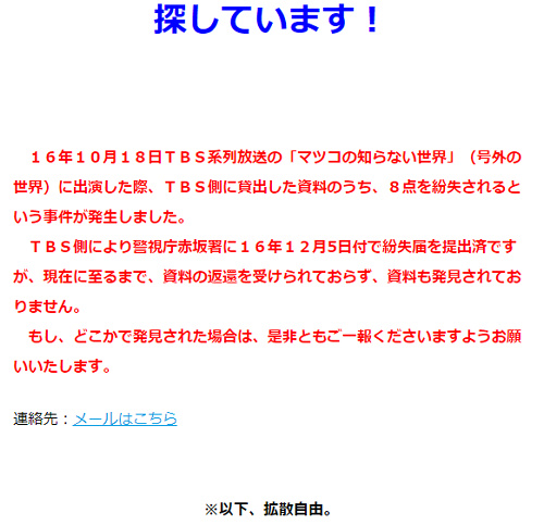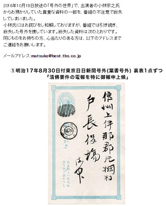 2016年10月18日に放送した『マツコの知らない世界(TBS系)』にて特集された「号外の世界」で、ゲストの小林宗之さんから借りていた貴重な資料の一部を番組側の不注意で紛失していたことが分かった。