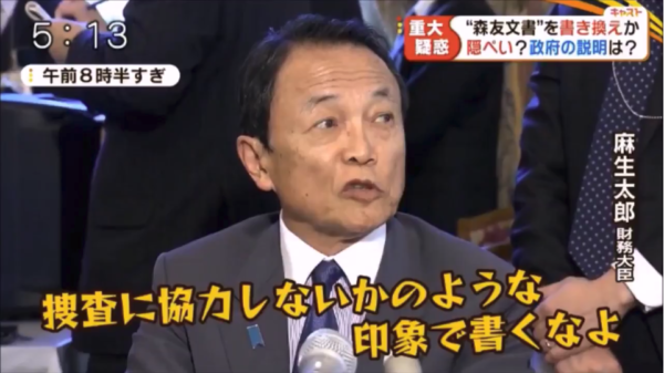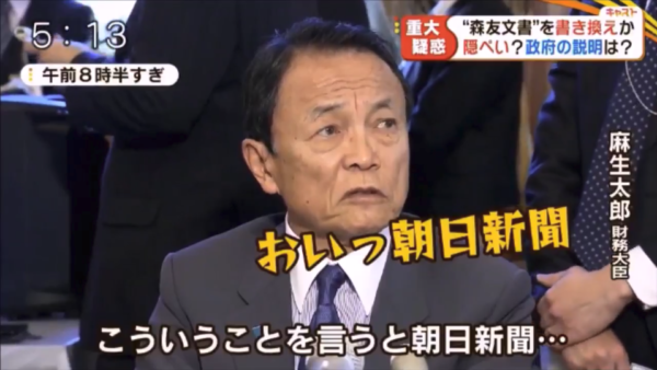 森友学園にかかわる決裁文書の書き換え疑惑で麻生大臣が朝日新聞の記者を強く叱る場面があった。朝日新聞にて「麻生大臣が捜査に協力しない」という印象操作がなされていた。