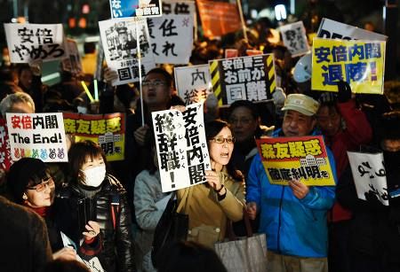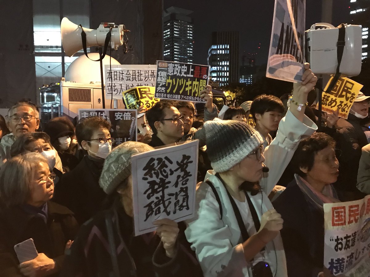 官邸前には12日夜、多くの市民が駆け付け、抗議集会を開いた。参加者はドラムのリズムに合わせて「うそをつくな」「改ざんするな」と声をそろえ、安倍晋三首相や麻生太郎財務相の辞任を迫った。
