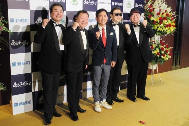 画像 取材に応じた栗田貫一(中央)。左からノブ&フッキーのフッキー、ノブ、栗田を挟みコージー冨田、カール北川=都内