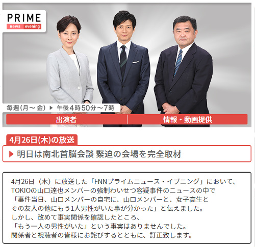 “4月26日(木)に放送した「FNNプライムニュース・イブニング」において、TOKIOの山口達也メンバーの強制わいせつ容疑事件のニュースの中で「事件当日、山口メンバーの自宅に、山口メンバーと、女子高生とその友人の他にもう1人男性がいた事が分かった」と伝えました。しかし、改めて事実関係を確認したところ、「もう一人の男性がいた」という事実はありませんでした。関係者と視聴者の皆様にお詫びするとともに、訂正致します。”