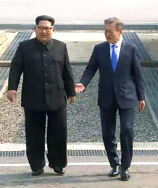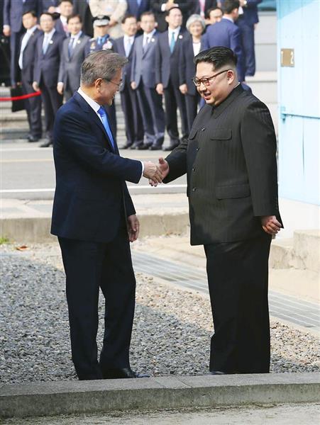南北軍事境界線を示す幅約50センチのコンクリートを挟んで握手した韓国の文在寅大統領と北朝鮮の金正恩朝鮮労働党委員長は笑顔で言葉を交わした。10年半ぶりとなる27日の南北首脳会談。金氏は徒歩で境界線を越え、韓国側の砂利を踏みしめた後、文氏を促し、手をつないでいったん北朝鮮側に戻る「サプライズ」を演出、和やかなムードで幕を開けた。