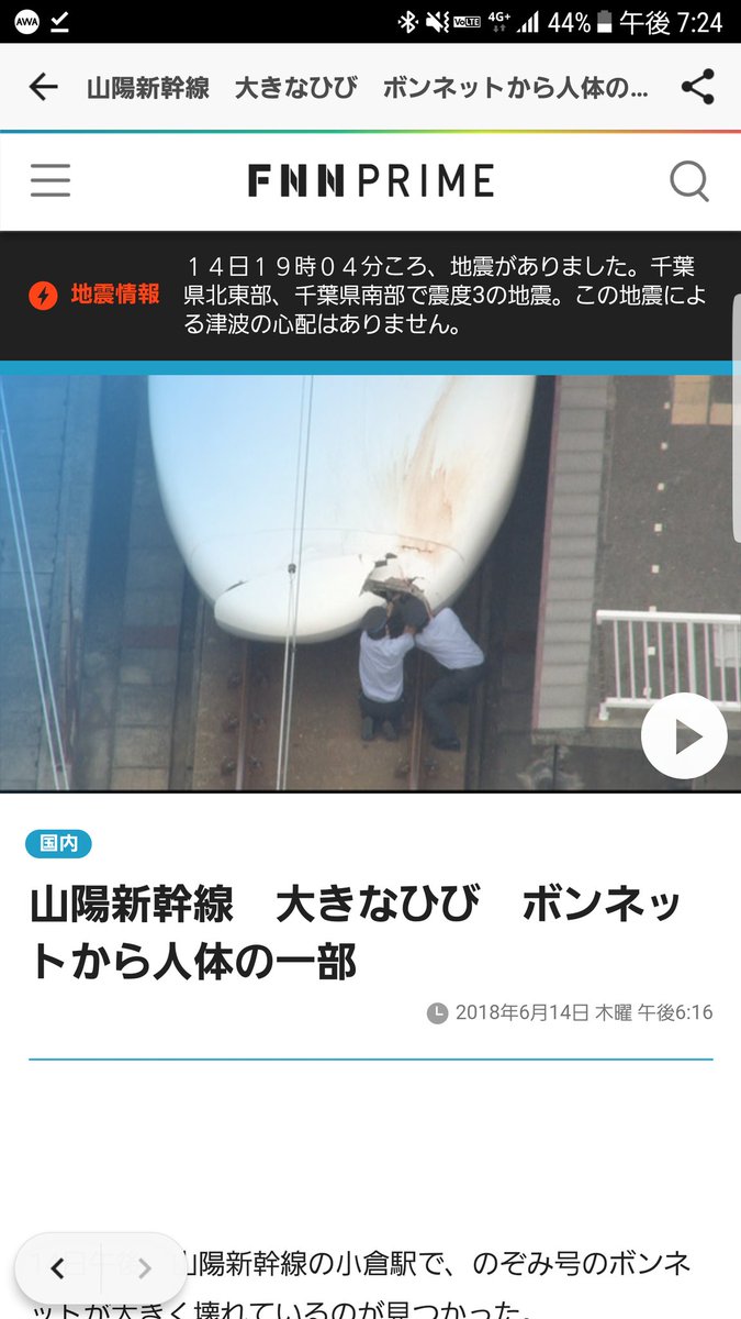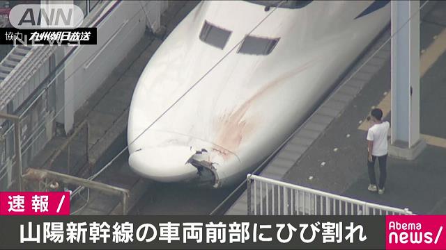 6月14日の午後、山陽新幹線がトンネル内で人と接触し車両の先頭部分が大きく破損していたことが発覚。先頭車両のボンネット部分に亀裂が入り、血痕のような赤いしみも確認できる。