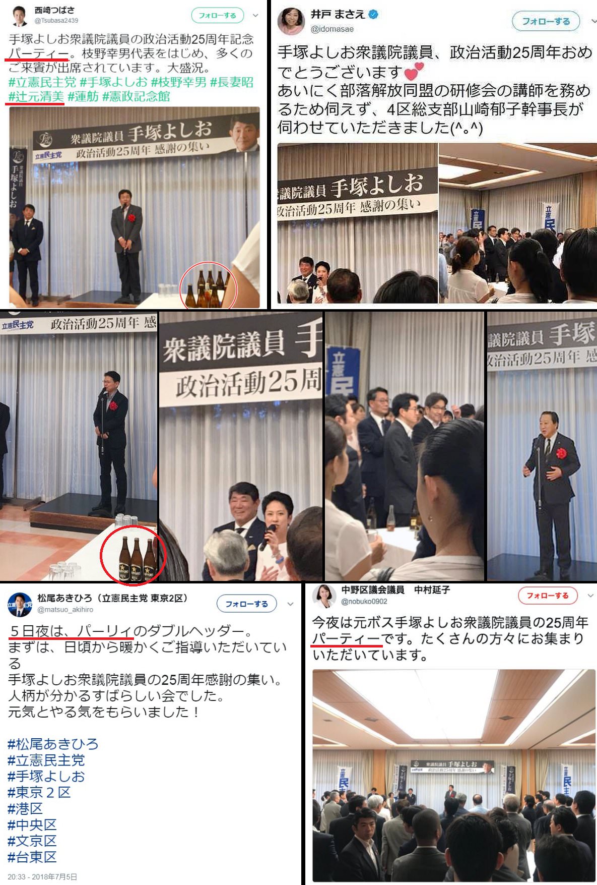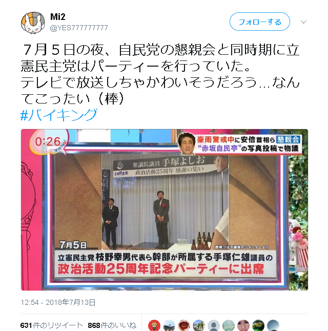 立憲民主党、豪雨災害の中でパーティーしてたことをテレビで報道されてしまうwywyw