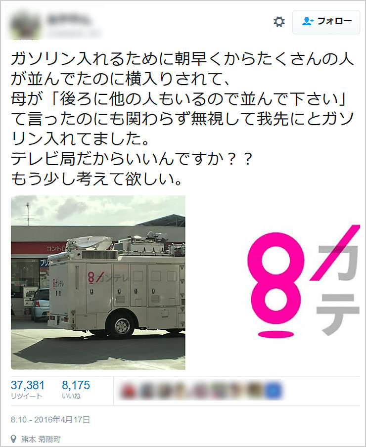 被災者を押しのけてまで給油するフジ系列の報道マンはプロの鑑