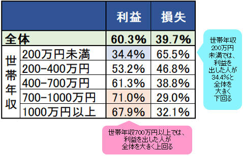 ?世帯年収と利益の関係を見ても、「残酷な現実」は示される。「世帯年収が高いほど、利益の割合が増える」という傾向だ。