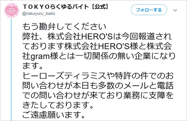 「平素より弊社媒体「TOKYOらくゆるバイト」をご愛顧いただきまして誠にありがとうございます。株式会社HERO’S広報担当です。テレビやインターネットメディア等で報道されております、「ヒーロズティラミス」特許に関する件でのお問い合わせを複数頂いておりますが、報道されています株式会社HERO’S様とは全くの別会社になります」