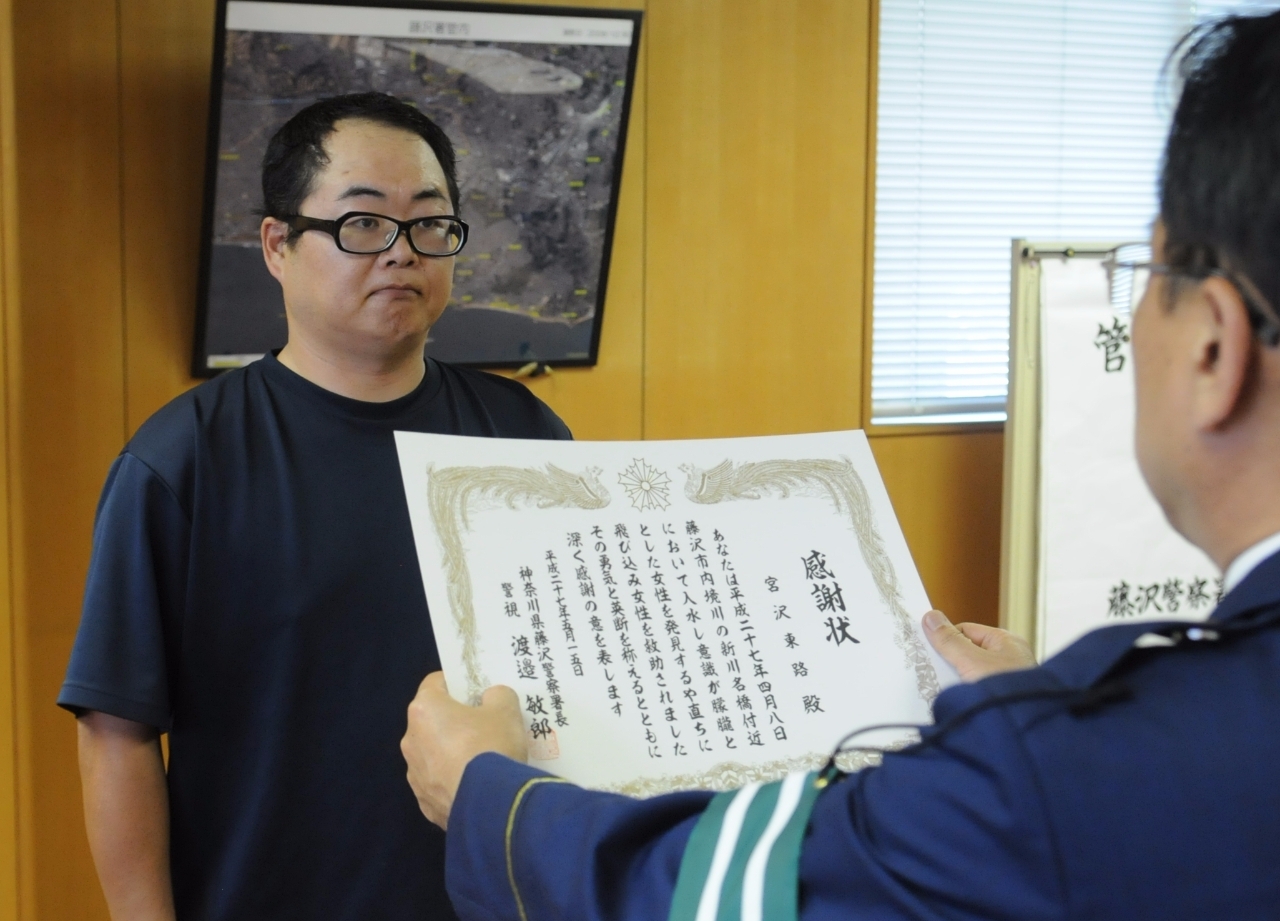 藤沢市川名1丁目の境川と柏尾川の合流地点でおぼれそうになっていた女性(22)を救助したとして、藤沢署は15日、同市柄沢の会社員宮沢東路さん(40)に感謝状を贈呈した。宮沢さんは「救助隊を待っていては手遅れになると思った。助かって本当によかった」と話していた。