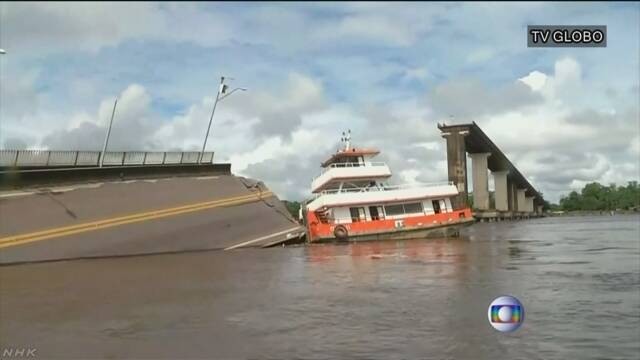 南米ブラジルで北部の川に架かる橋に船が衝突して、200メートル以上にわたって橋が崩れ、転落した車に乗っていた少なくとも5人の行方がわからなくなっています。この橋はブラジルの穀物の輸出を支える主要なルートになっていて、地元政府は非常事態を宣言して、行方不明者の捜索と、う回路の確保を急いでいます。