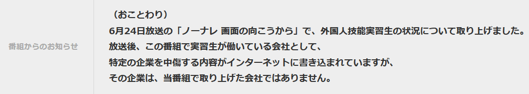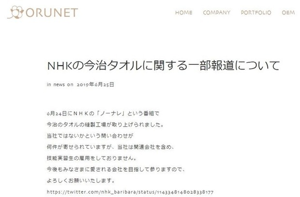 2019年6月24日放送のNHKの番組を受け、タオル製品の製造・販売を行う「オルネット」(愛媛県今治市)が声明を出した。