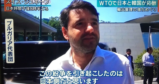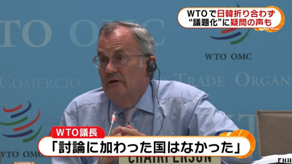 韓国に対する日本政府の輸出優遇措置の撤廃をめぐり、日韓双方がWTO(世界貿易機関)の会議でそれぞれの立場を訴えたが、主張は折り合わないままだった。国際機関で繰り広げられた日韓の議論に対する各国の反応は薄く、世界に訴える韓国の狙いは達成できたとは言えない状況。スイスのジュネーブで開かれたWTOの一般理事会では、韓国側が、日本の措置は「不当だ」と批判したのに対し、ジュネーブ駐在の伊原大使は、「WTOで議論するのは適切ではない」、「WTOのルールに違反しない」と反論した。(略)