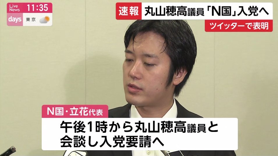 【速報】「NHKに不満よな。丸山、動きます」と丸山穂高議員、N国への入党要請に応じる意向を固める。本日13時から先日と同じ場所で立花議員と会談。その後、最終合意できればその場にて記者会見に切り替え予定。