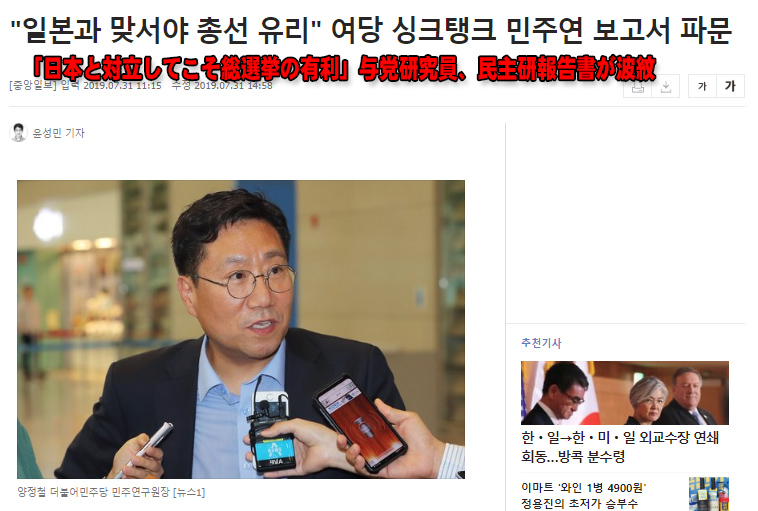 韓国の民主党研究員が30日「日本に断固として対抗することは来年の総選挙に有利になる」という内容が書かれた報告書があったことを所属党員らに送り波紋が広がっている。