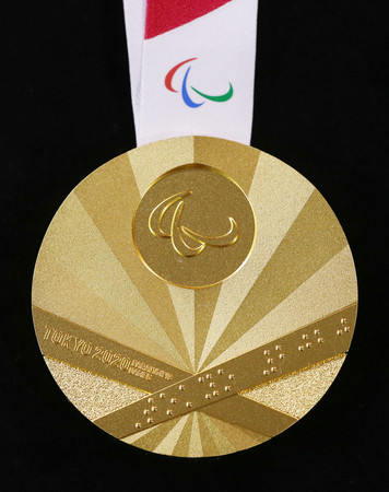 2020年東京パラリンピックの金メダルの表面=8月23日撮影