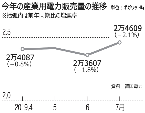 産業用電気消費量が4月から7月まで4カ月連続で減少したことが分かった。韓国国内の電力消費の半分以上を占める産業部分で長期間の電力需要減少が続くのは異例で、景気低迷の兆候ではないかと懸念が高まっている。