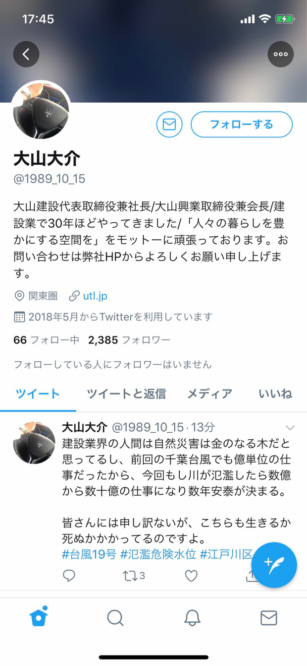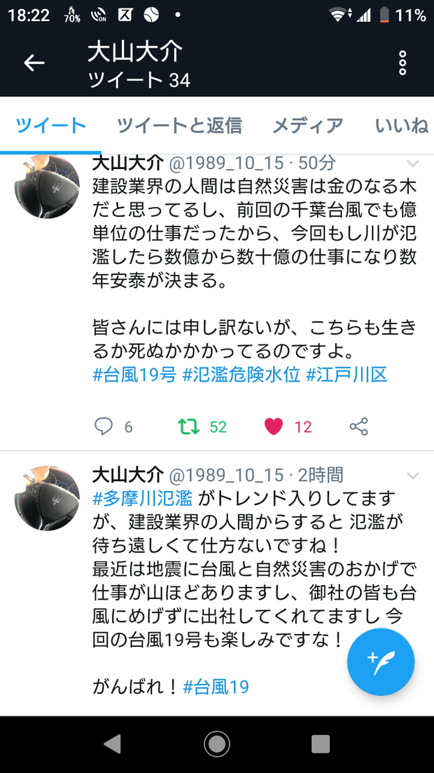 建設会社社長さん「多摩川が氾濫すれば数億から数十億の仕事になって数年安泰。がんばれ19号!!」