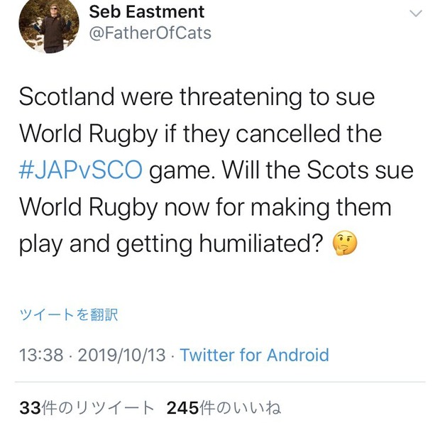 【悲報】ラグビーで日本に負けたスコットランド、世界中から煽られてしまう