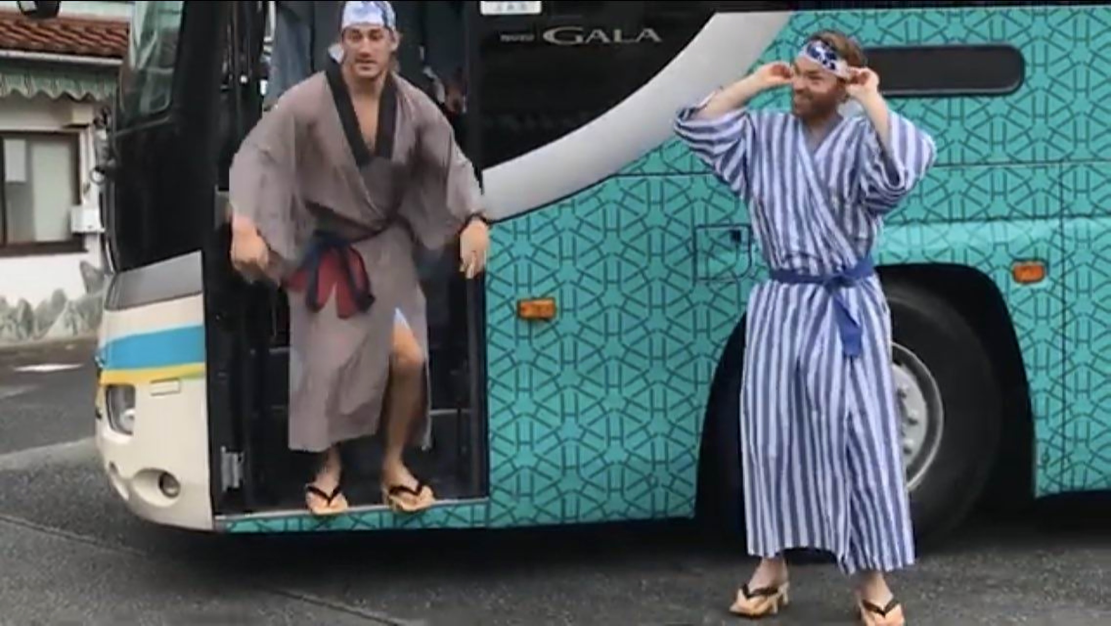 浴衣でバスから颯爽と登場