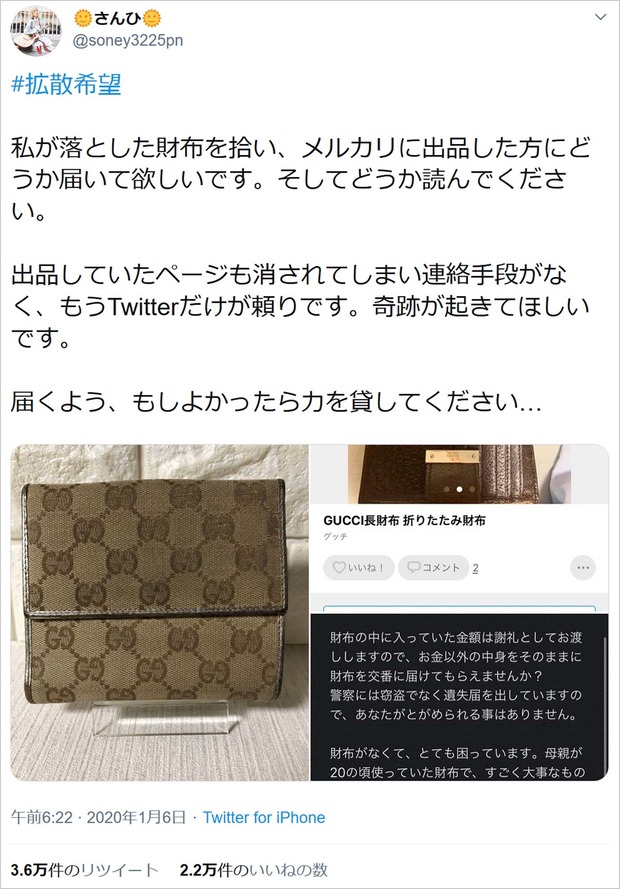「私が落とした財布を拾い、メルカリに出品した方にどうか届いて欲しいです。そしてどうか読んでください。出品していたページも消されてしまい連絡手段がなく、もうTwitterだけが頼りです。