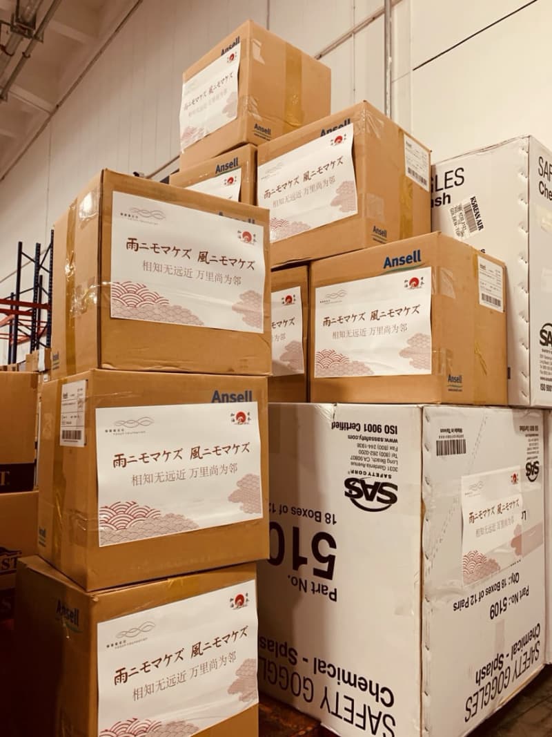 支援物資の箱には日本語で「雨ニモマケズ、風ニモマケズ」、中国語で「相知無遠近、万里尚為隣(相知には遠近なく、万里なお隣たり)」と両国で良く知られる詩が書かれた紙が張られていた。